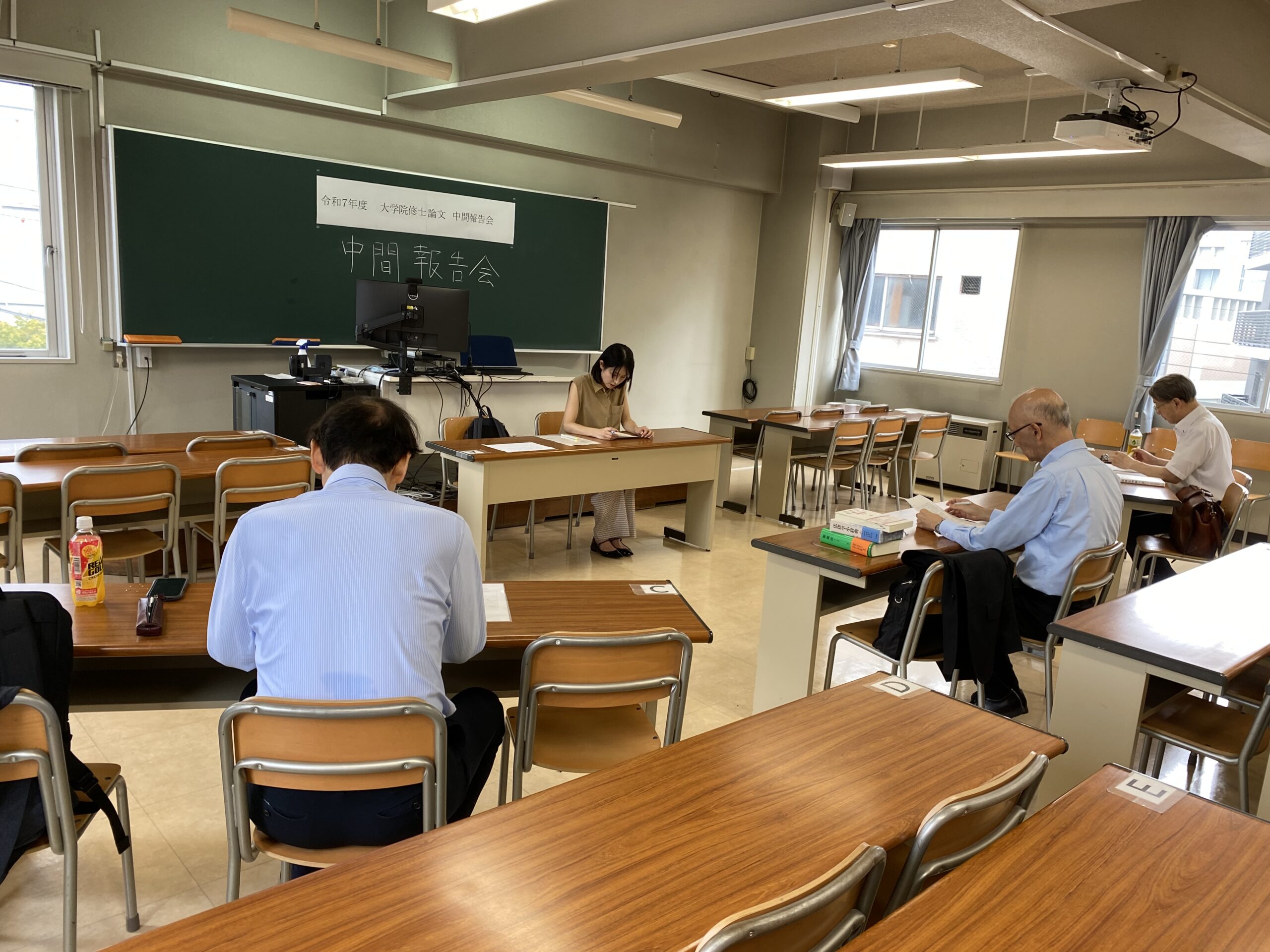 中間報告会は、大学院2年生全員が修士論文作成に向けて、論文の背景や先行研究、研究の仮説と検証など、研究の進捗状況について発表し、主査と副査2名の教員から論文内容についてアドバイスを受け、修士論文に反映させていくことを目的としています。